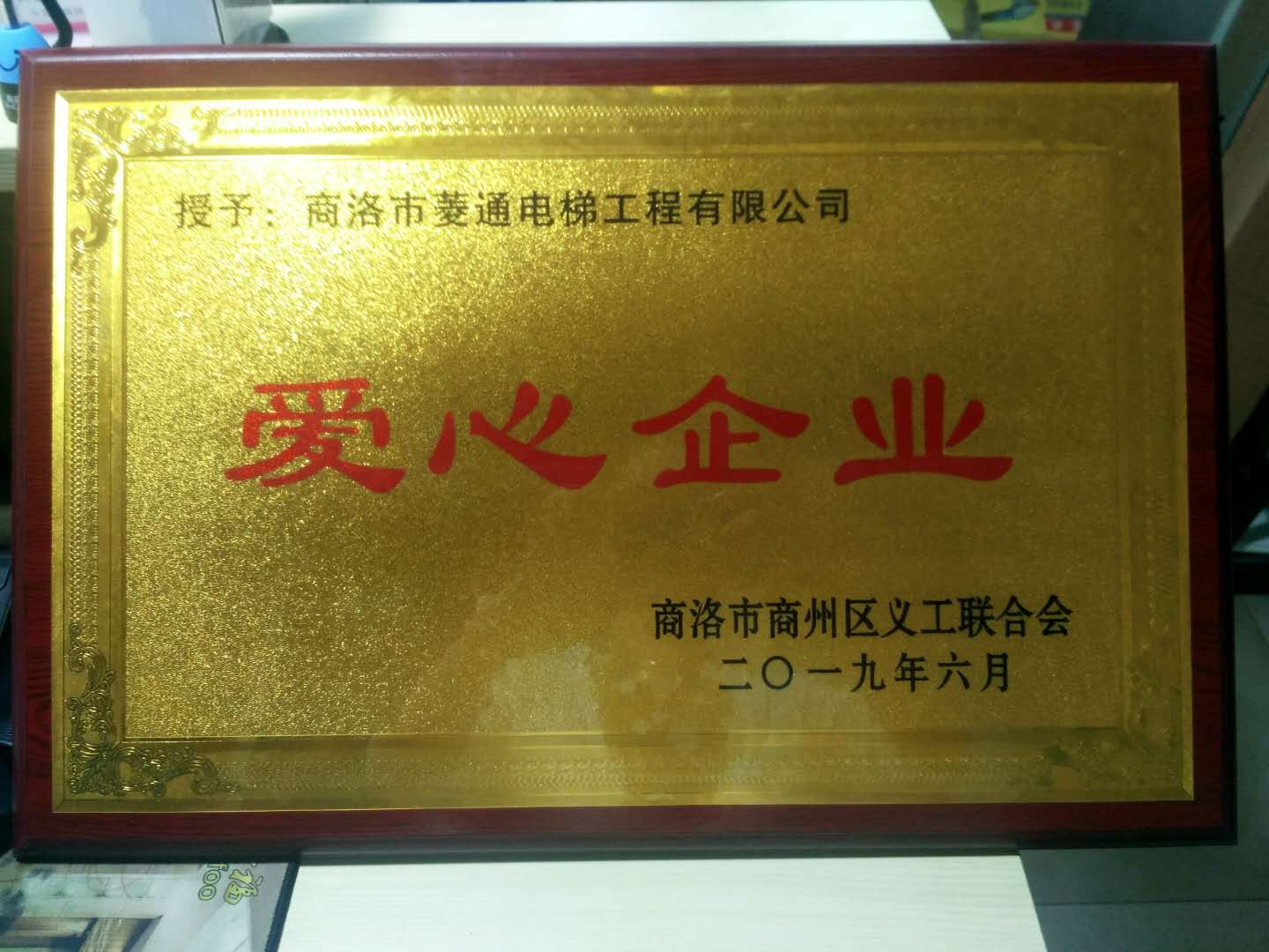 商洛市義工聯(lián)合會(huì)2019年6月,授予:商洛市菱通電梯工程有限公司愛(ài)心企業(yè)獎(jiǎng)